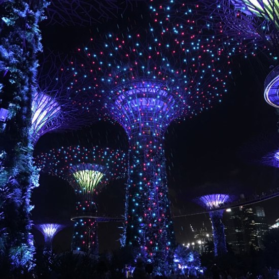 Finally, at 8:45pm we saw the Supertrees. The Supertrees are huge man-made trees with a concrete core and metal trellises on which plants grow. We watched a light show at the Supertree Grove. The Supertrees danced to music for 15 minutes! Lights of all colors whirled around them. The lights moved and created many shapes. They flew around the branches above us. We were in a heaven of light!