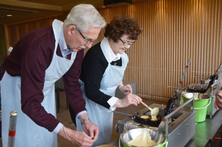 Grandpa and Grandpa fill the mold with batter